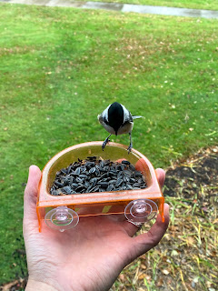 With the gift of a late start to the workday yesterday, I found myself in my room while the birds were eating breakfast. I had also noticed that my feeder on my window was beginning to slip. I opened it up to try and fix the suction cups, but it didn’t work. I decided to hold out the feeder since the birds were still flying close by. After some continued to land in my “hand-held feeder,” I thought I would try something that I’ve been meaning to do for a while.