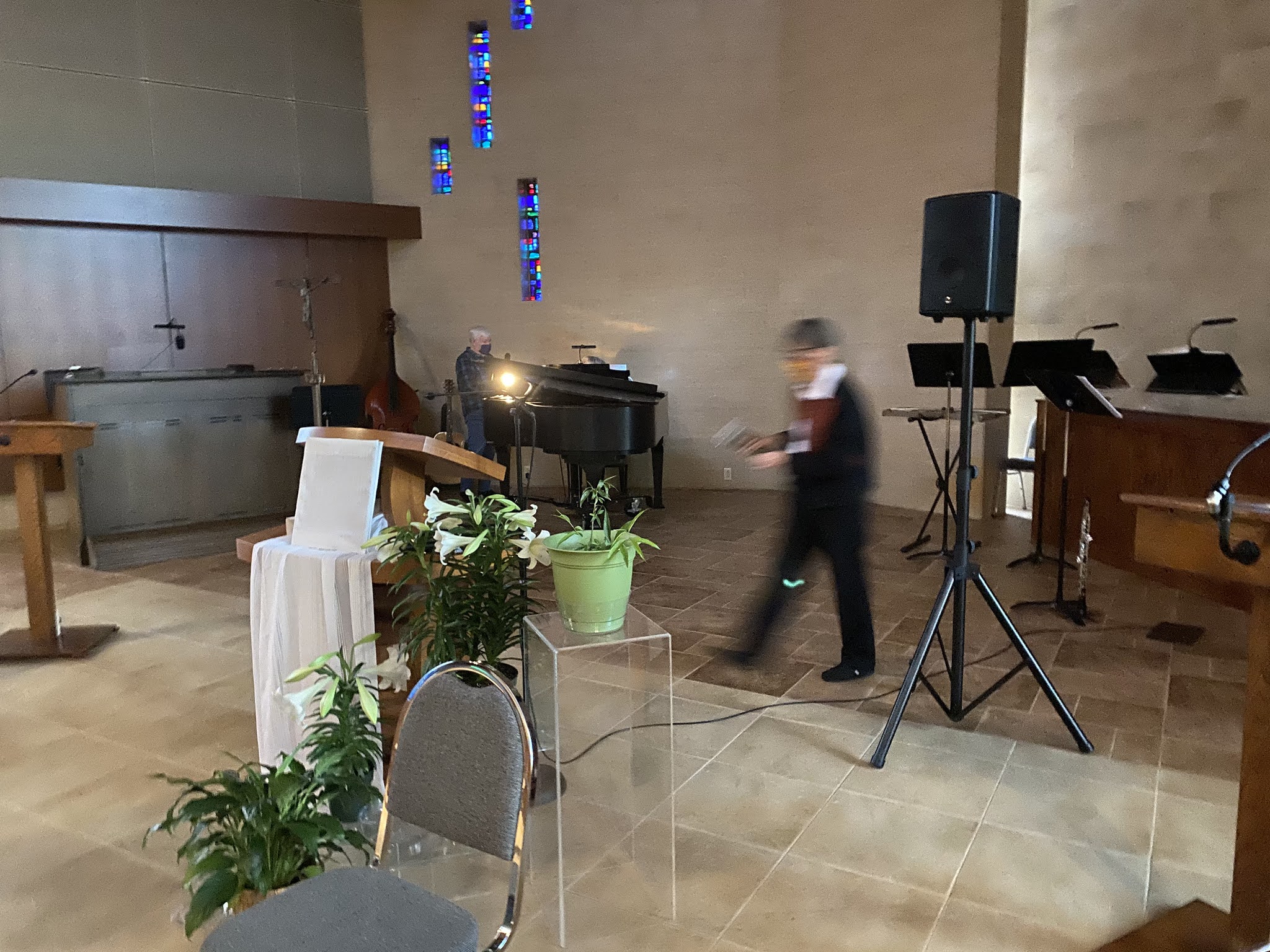Out of nowhere appeared a rechargeable sound system, flashlights, lanterns, headlights, systems rigged to hold them all in place. Everyone began to give the go-ahead…you could hear the music traditionally played on the computer-powered organ being practiced on the piano.