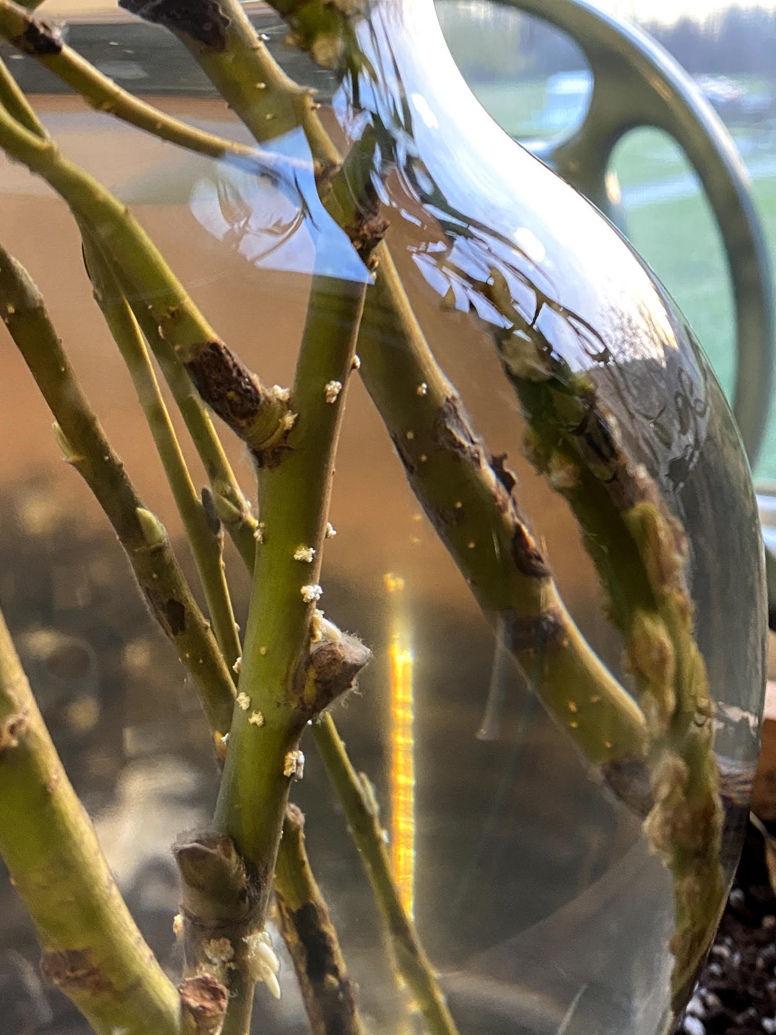 Well, Jackie reported to me that, indeed, the branches have grown new leaves! There seem to be hints of roots beginning to become visible, too!